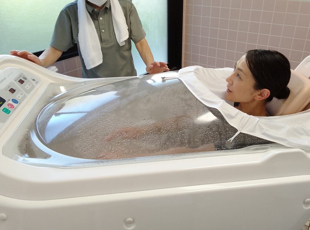 「足腰が弱くなり入浴に不安がある方」「浴槽に浸かることが難しい方」など、入所者様が安心してご利用いただける設備です。浴槽に設置された複数のノズルからはミスト状の温かいシャワーが噴霧され、身体の隅々までやさしく洗い上げるとともに、浴槽カバーとネックカーテンで浴槽を覆うため体の芯までしっかり温まる設計となっています。